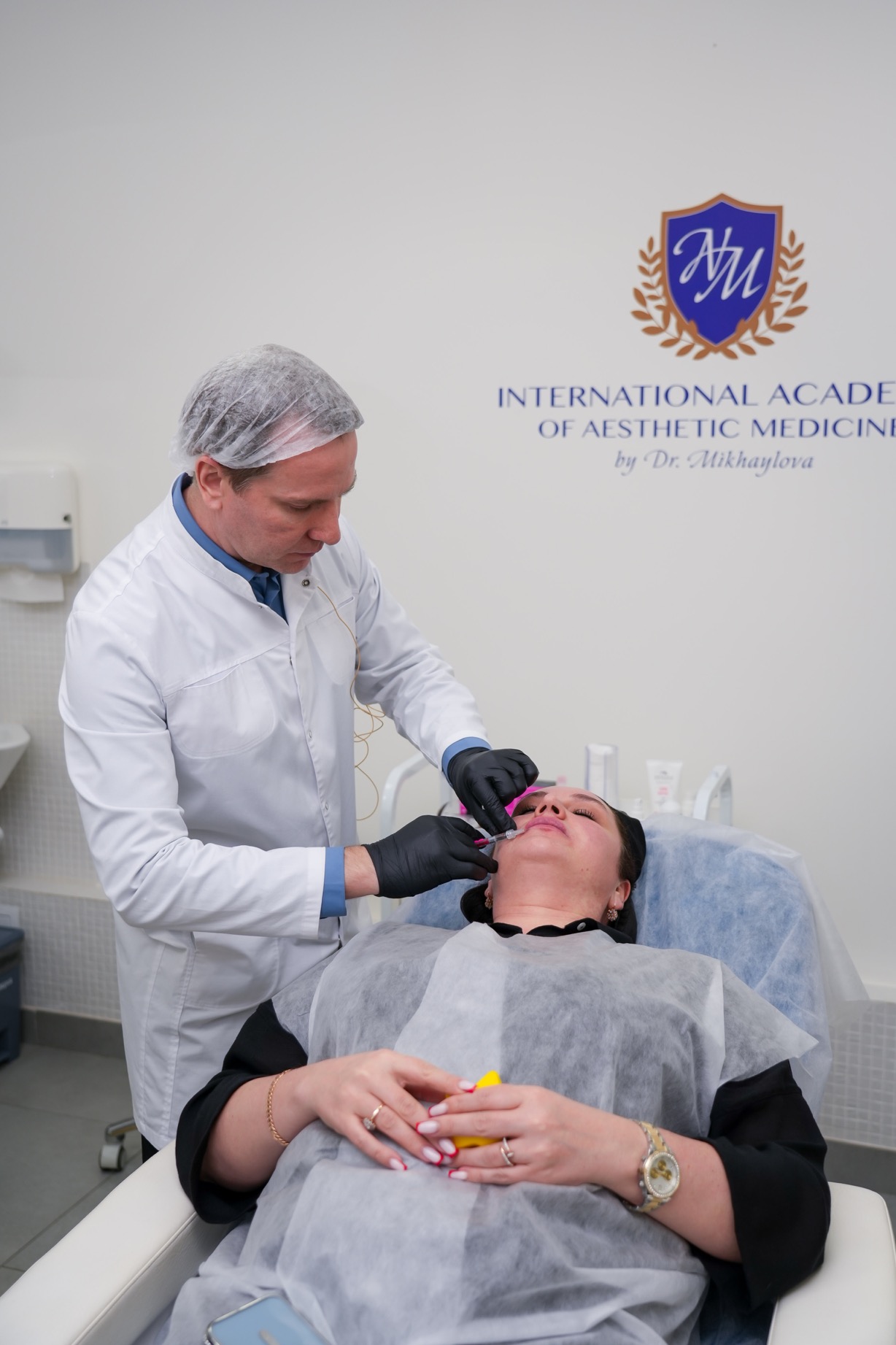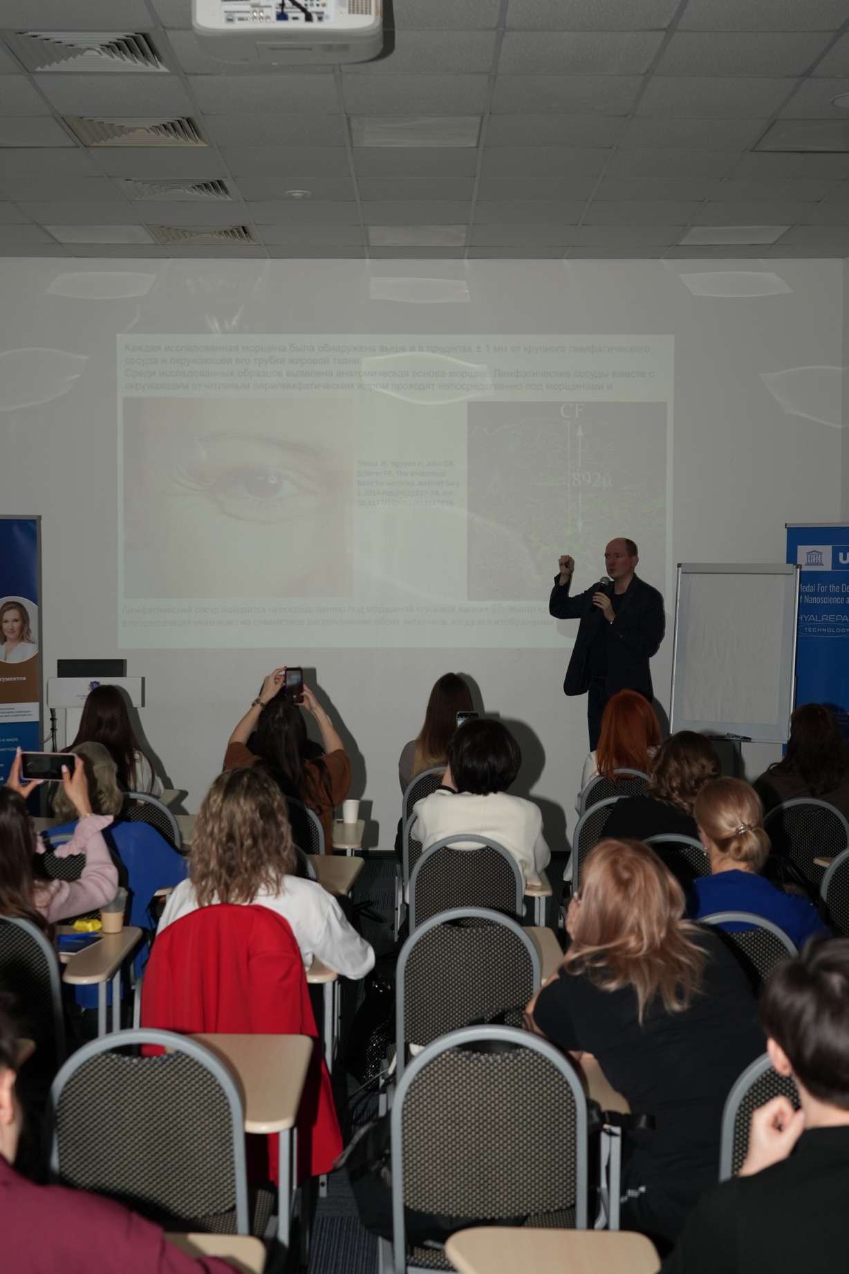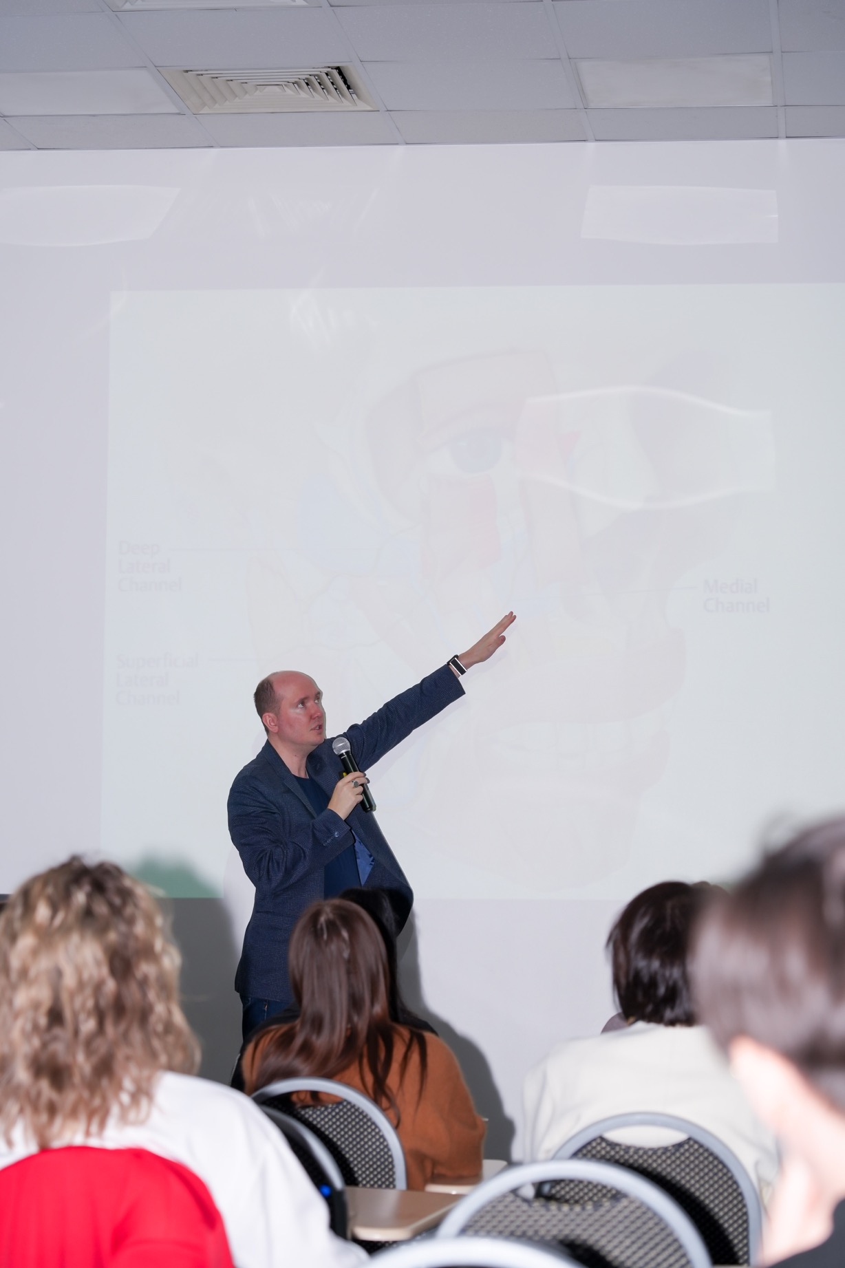 Семинары и лекции в Академии проводят не только собственные врачи, но и сторонние спикеры. День рождения не стал исключением — своим опытом поделился Юрий Васильев, профессора, д.м.н., ведущий анатом Института анатомии. Его лекция «Главные правила контурной пластики: анатомия, которая защищает. Техники безопасной коррекции» была посвящена клинической анатомии скулоорбитального комплекса и периоральной зоны. Спикер подчеркнул особую ценность формата, когда о строении лица врачам-косметологам рассказывает именно врач-анатом: это позволяет глубже понять риски, повысить качество и скорость работы, снизить количество осложнений и чувствовать себя увереннее в ежедневной практике. Отдельное внимание было уделено юридическим аспектам работы врача — теме, которая редко затрагивается на образовательных курсах, но имеет принципиальное значение.
