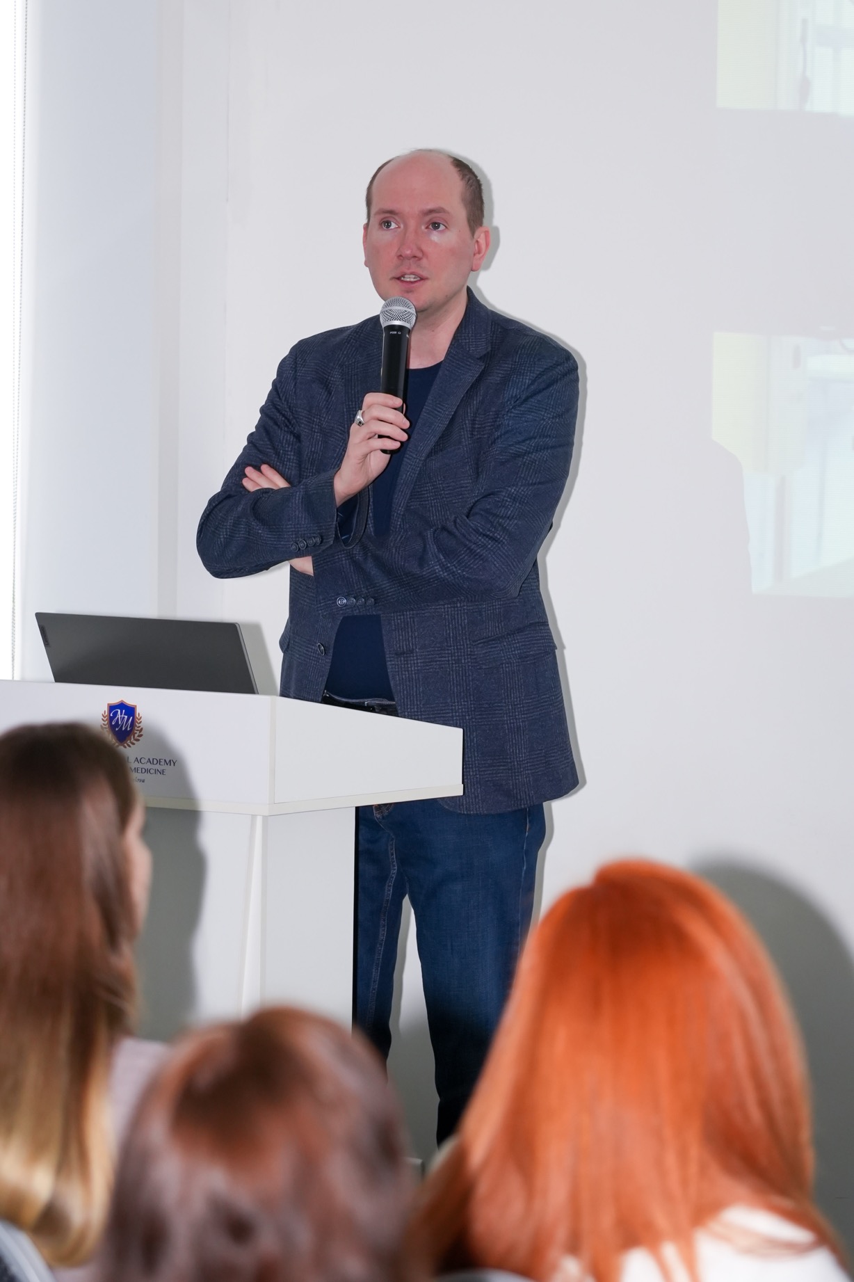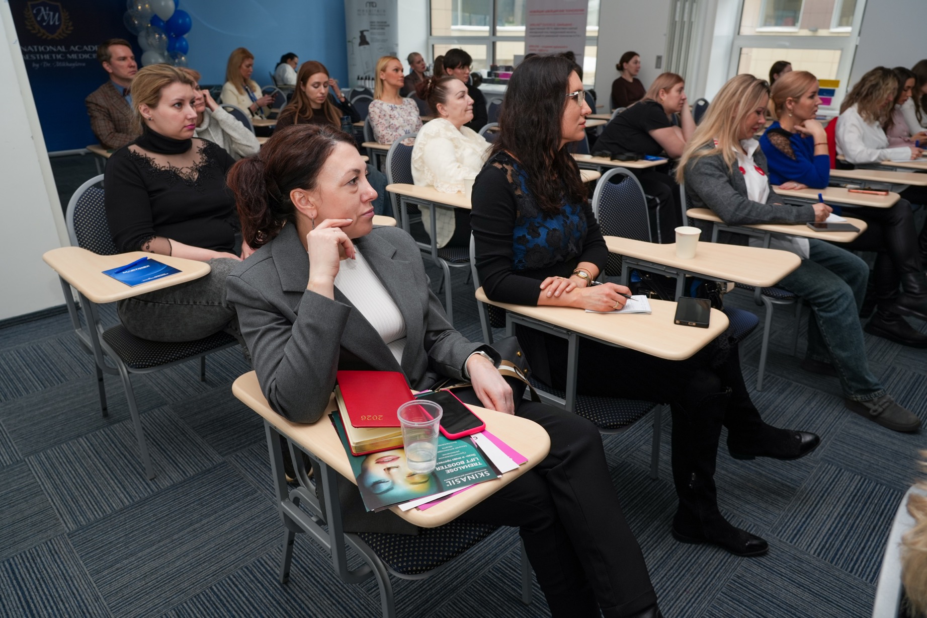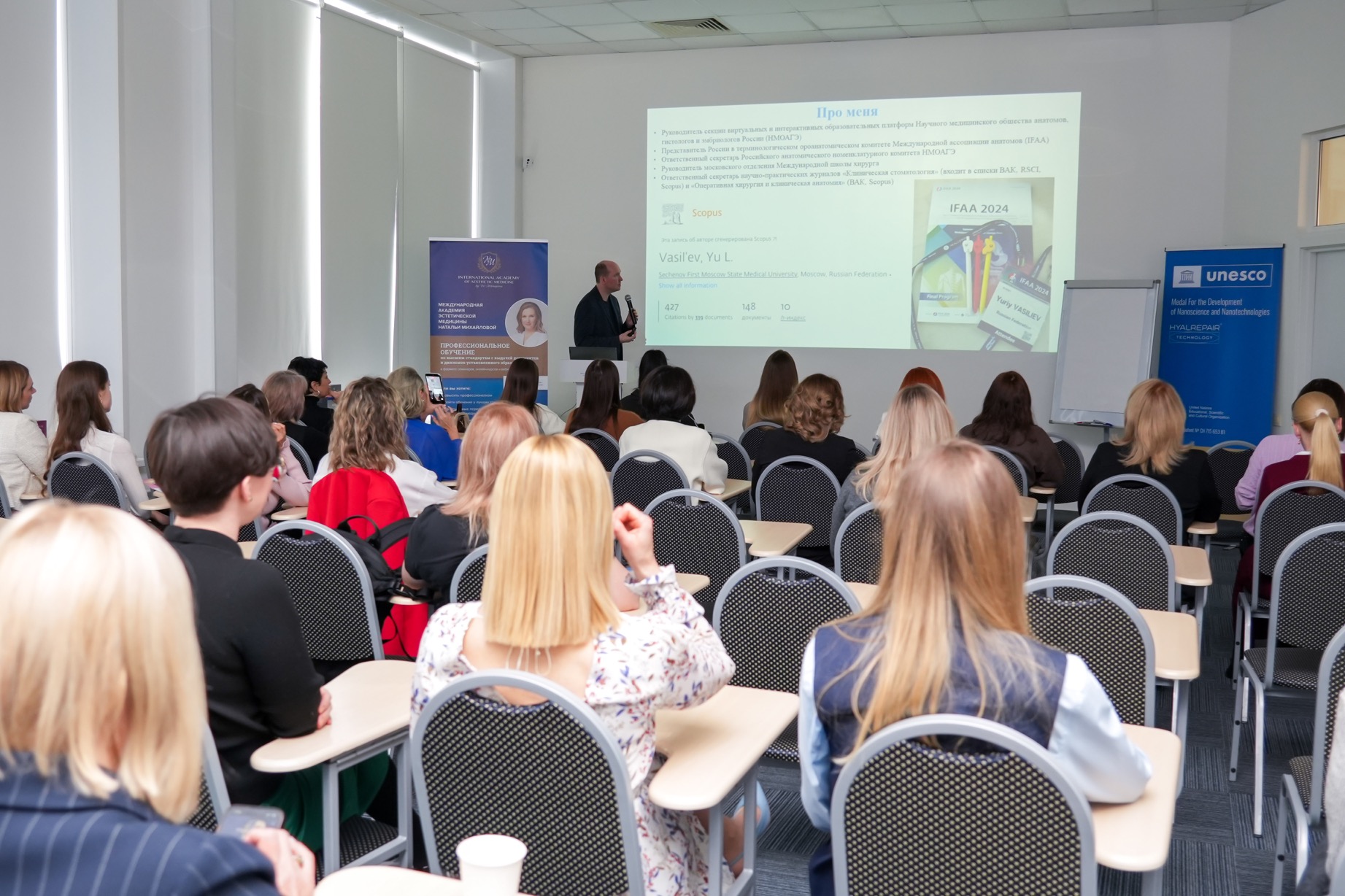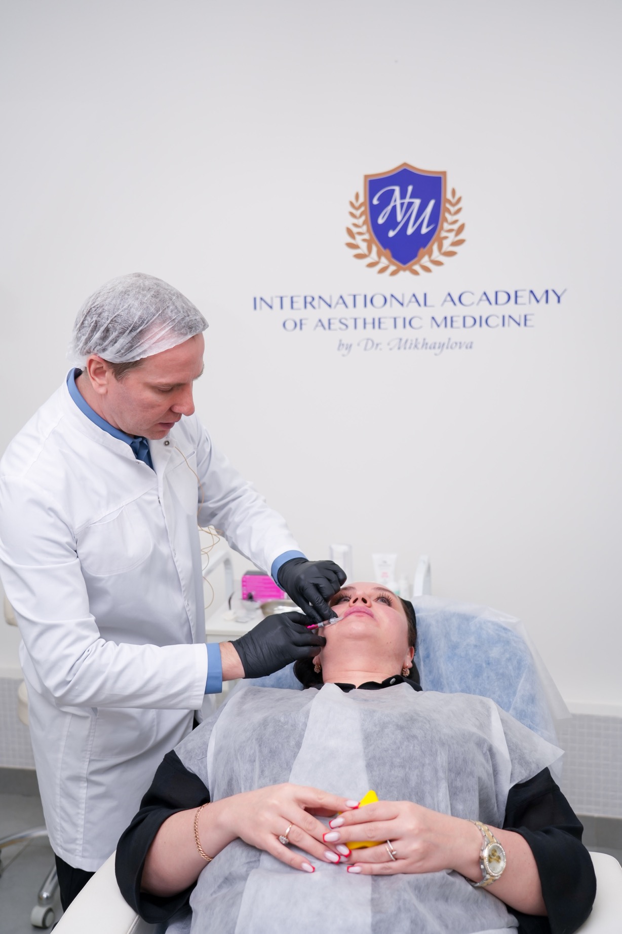 Семинары и лекции в Академии проводят не только собственные врачи, но и сторонние спикеры. День рождения не стал исключением — своим опытом поделился Юрий Васильев, профессора, д.м.н., ведущий анатом Института анатомии. Его лекция «Главные правила контурной пластики: анатомия, которая защищает. Техники безопасной коррекции» была посвящена клинической анатомии скулоорбитального комплекса и периоральной зоны. Спикер подчеркнул особую ценность формата, когда о строении лица врачам-косметологам рассказывает именно врач-анатом: это позволяет глубже понять риски, повысить качество и скорость работы, снизить количество осложнений и чувствовать себя увереннее в ежедневной практике. Отдельное внимание было уделено юридическим аспектам работы врача — теме, которая редко затрагивается на образовательных курсах, но имеет принципиальное значение.